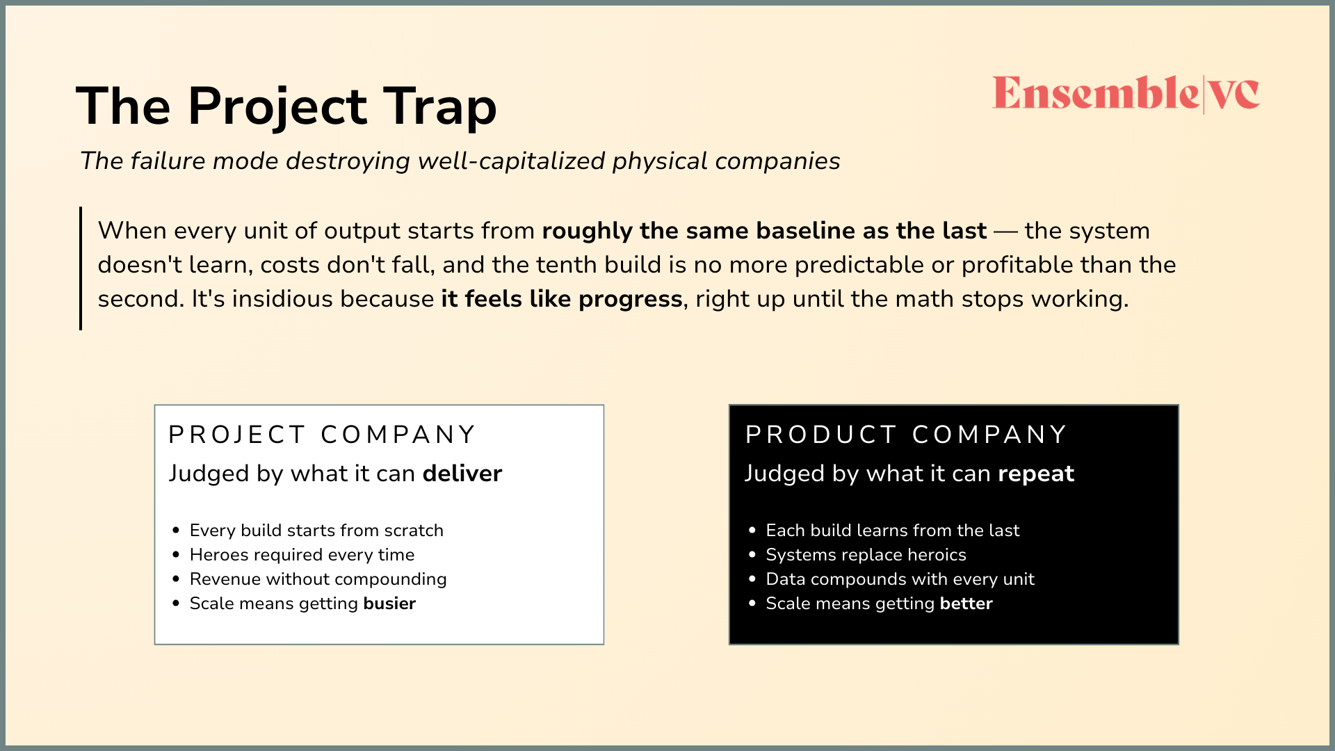 Most companies never get there. Not because of the vision or the market, but because they fall into what we call the project trap: each output begins from a similar baseline as the last. The system fails to learn and costs don't decrease. The tenth build is just as unpredictable and unprofitable as the second.